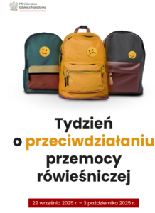 W dniach 29 września – 3 października 2025 r. w naszej szkole organizowane są akcje promujące „Tydzień o Przeciwdziałaniu Przemocy Rówieśniczej”. Akcje podyktowane są ogólnopolską inicjatywą Ministerstwa Edukacji Narodowej. To czas, w którym wspólnie chcemy pokazać, jak ważne jest tworzenie bezpiecznych miejsc nauki i budowanie relacji opartych na szacunku.